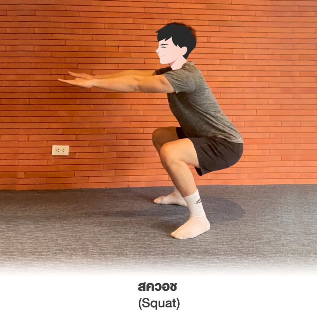 · ย่อเข่าลง ใดยขณะที่คุณย่อเข่าจะต้องไม่ให้หัวเข่าเลยปลายเท้า ย่อลงไปให้ได้มุมเข่า 90 องศา สามารถยื่นแขนมาข้างหน้าเพื่อทรงตัวได้แล้วลุกขึ้น